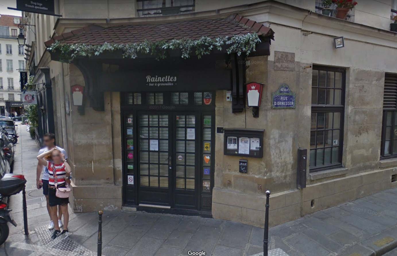 Helaas is de naam van het café niet te vinden op de foto’s. Op google maps is de vroegste naam “Rainettes, bar a grenouilles”. daarna was het een Italiaans restaurant “Soprano” en tegenwoordig is het “Keko Momo” een restaurant met traditioneel gemoderniseerd chinees eten. Als je “Keko Momo” Parijs google-ed vind je ook een paar foto’s van het interieur.