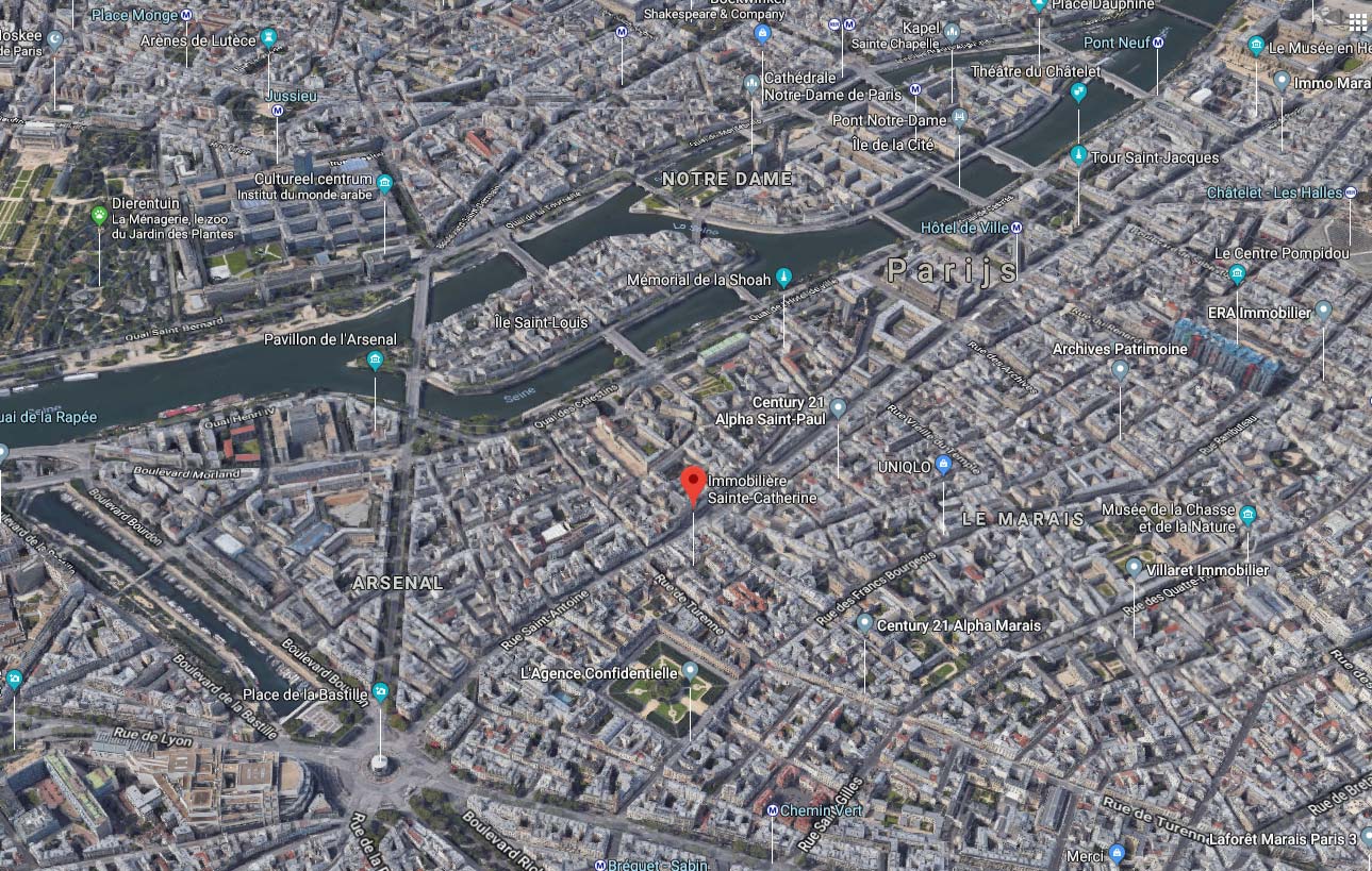 Is de plek waar de foto is genomen terug te vinden? Voor wie een beetje bekend is in Parijs, het 4de ligt ten noorden van de Seine in het hart van het centrum op de zogenaamde Rive Droite. Het omvat een groot deel van de twee eilanden waaronder de Notre Dame. De rode aanwijzer is de plek waar de foto is genomen.