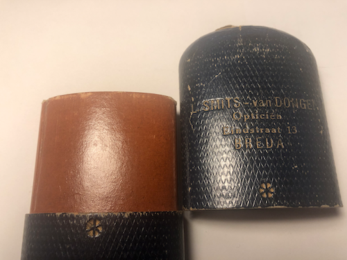 Op de bril uit de documententrommel staat geen merk maar voldoet verder aan alle kenmerken van een ziekenfondsbril. De bril was geleverd door Smits-van Dongen Opticien, Eindstraat 13 Breda6 in een blauwe papieren brillenkoker. Hoewel de koker aan de onderkant erg beschadigt is de conditie verder redelijk. De opdruk is goed te lezen maar het belangrijkste is dat er op de onder- en bovenkant een kleine merkje staat.