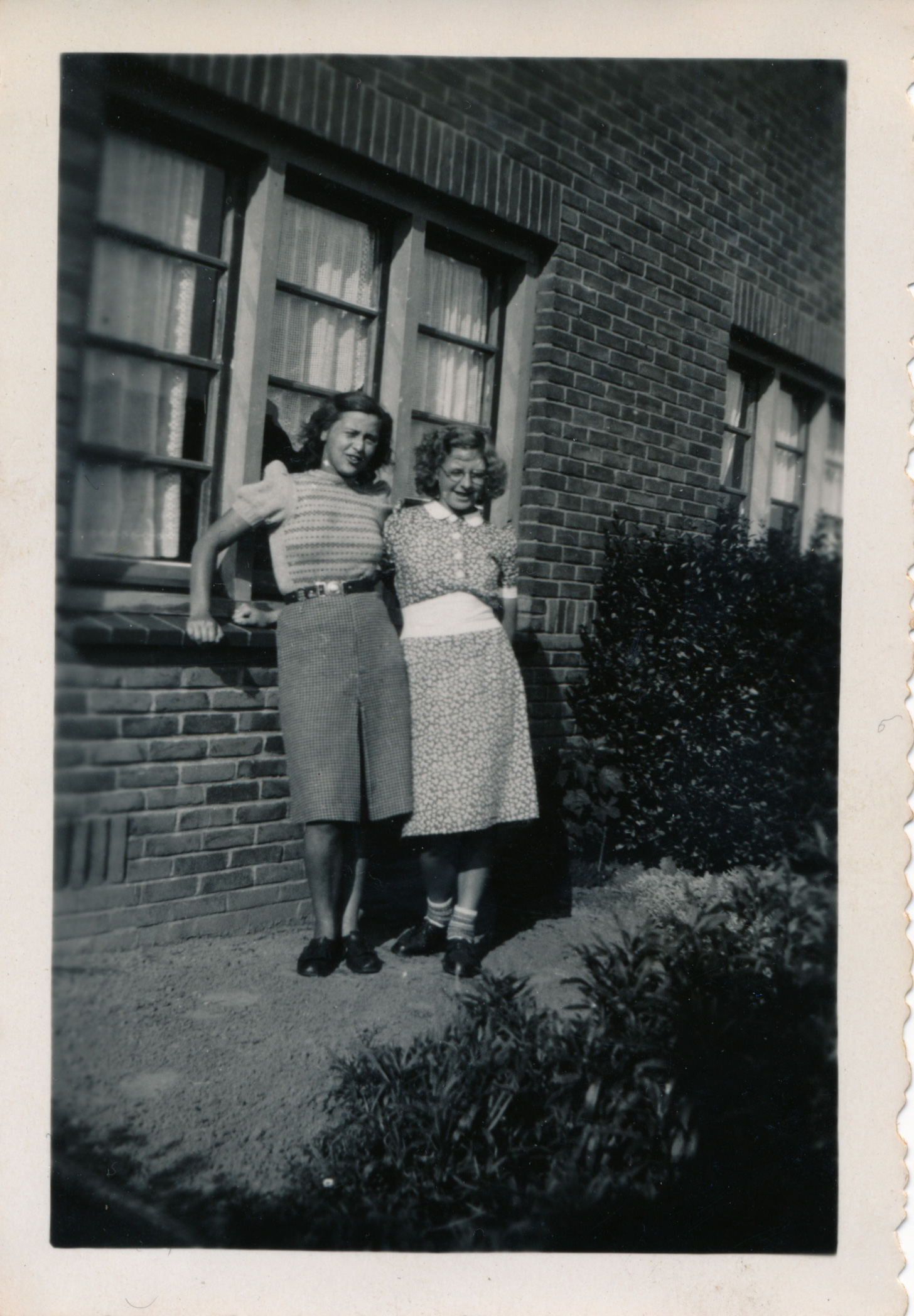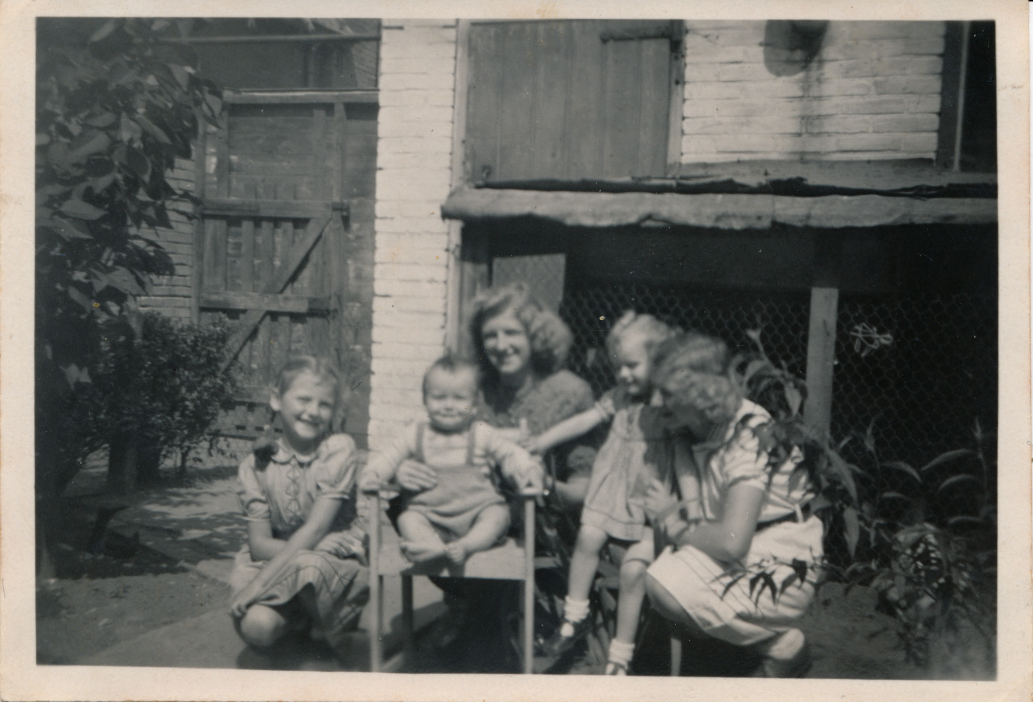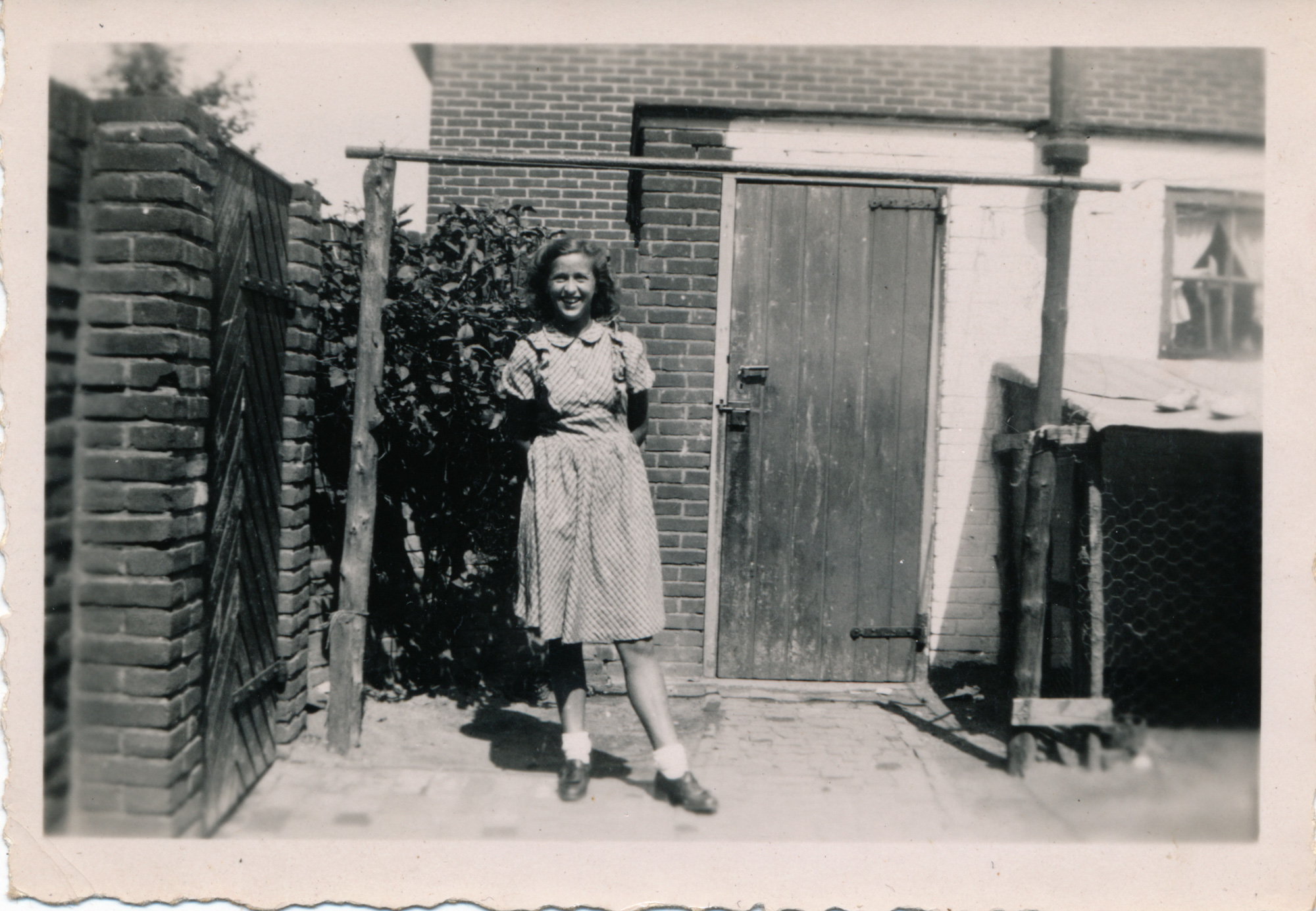 De eerste foto is uit 1947. Ze staat voor een schuur, links is een muur met een poort. Op de foto van Tante Jo in de tuin zie je dat je vanuit die tuin op de zijkant van een huis kijkt. Maar ook dat er nog twee huizen meer staan. Dit zou de familie van Wanrooy (Wanrooij) zijn.