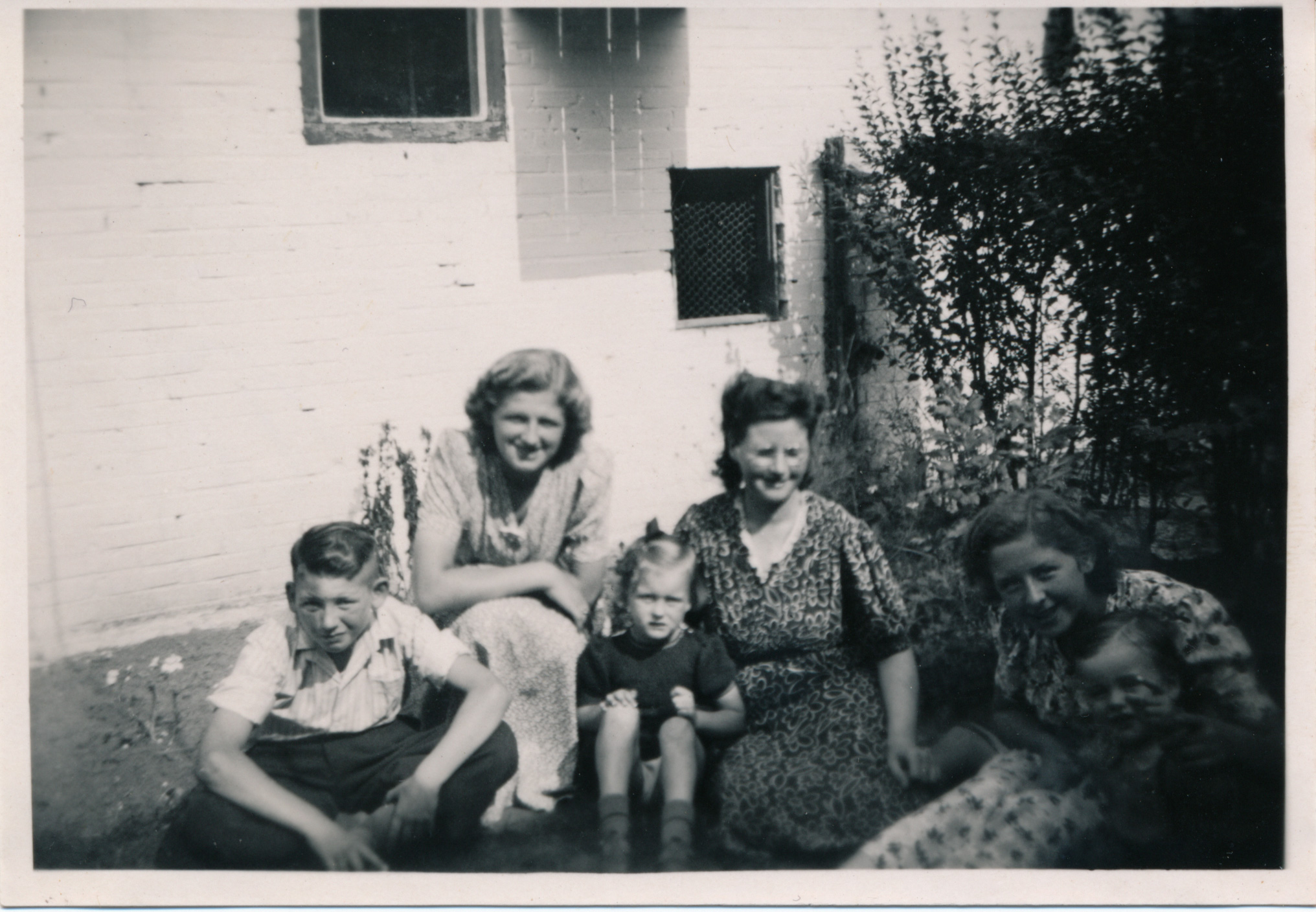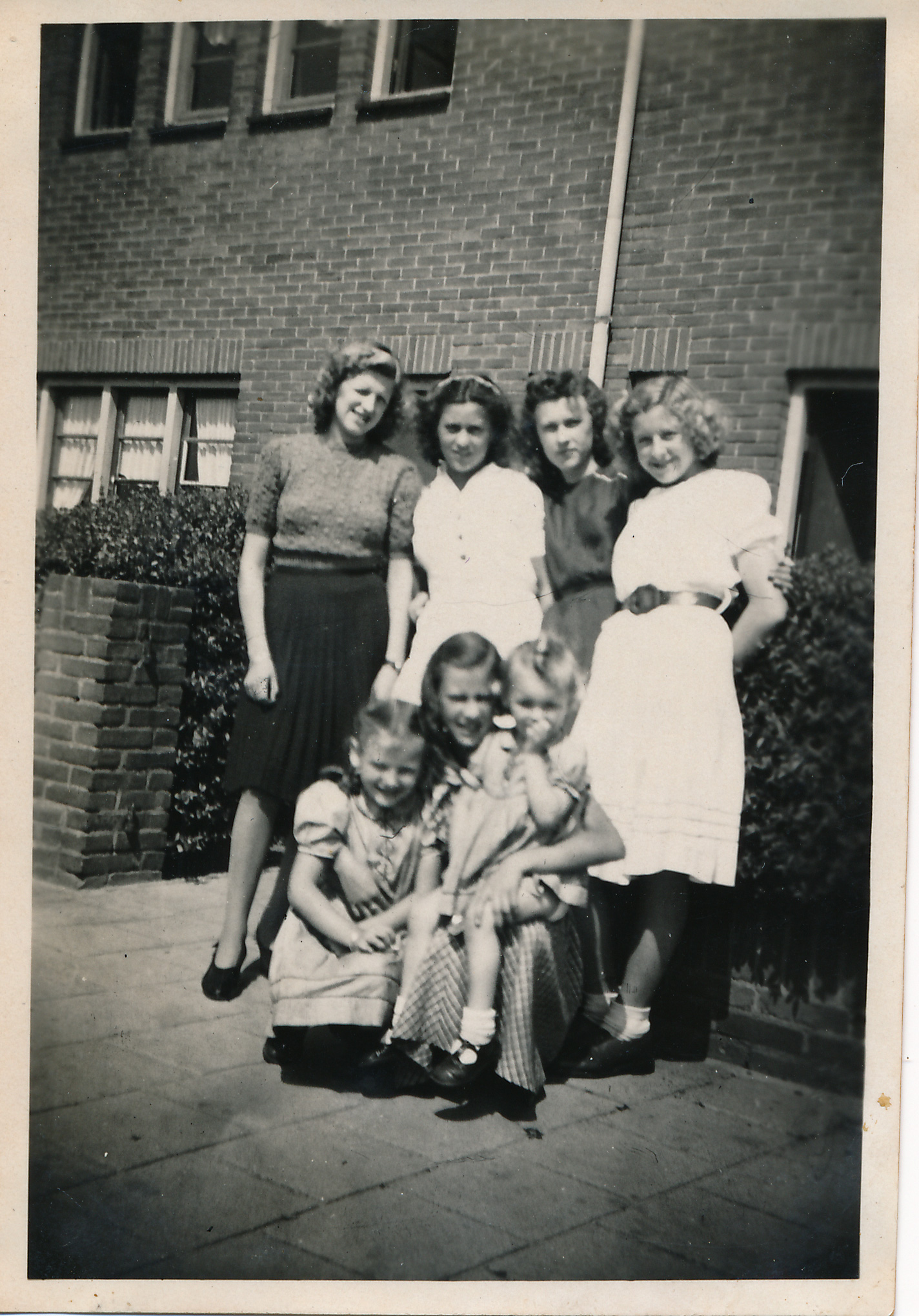 Corrie Benoist | Alma van den Broek (kind van Riet) | Johanna (Jo) Vernooy-in de Wei | Ine van den Broek (meisje met lange krullen) | Tonnie Vernooy | Ton Benoist | vrouw met plooirok onbekend Voor van links naar rechts: