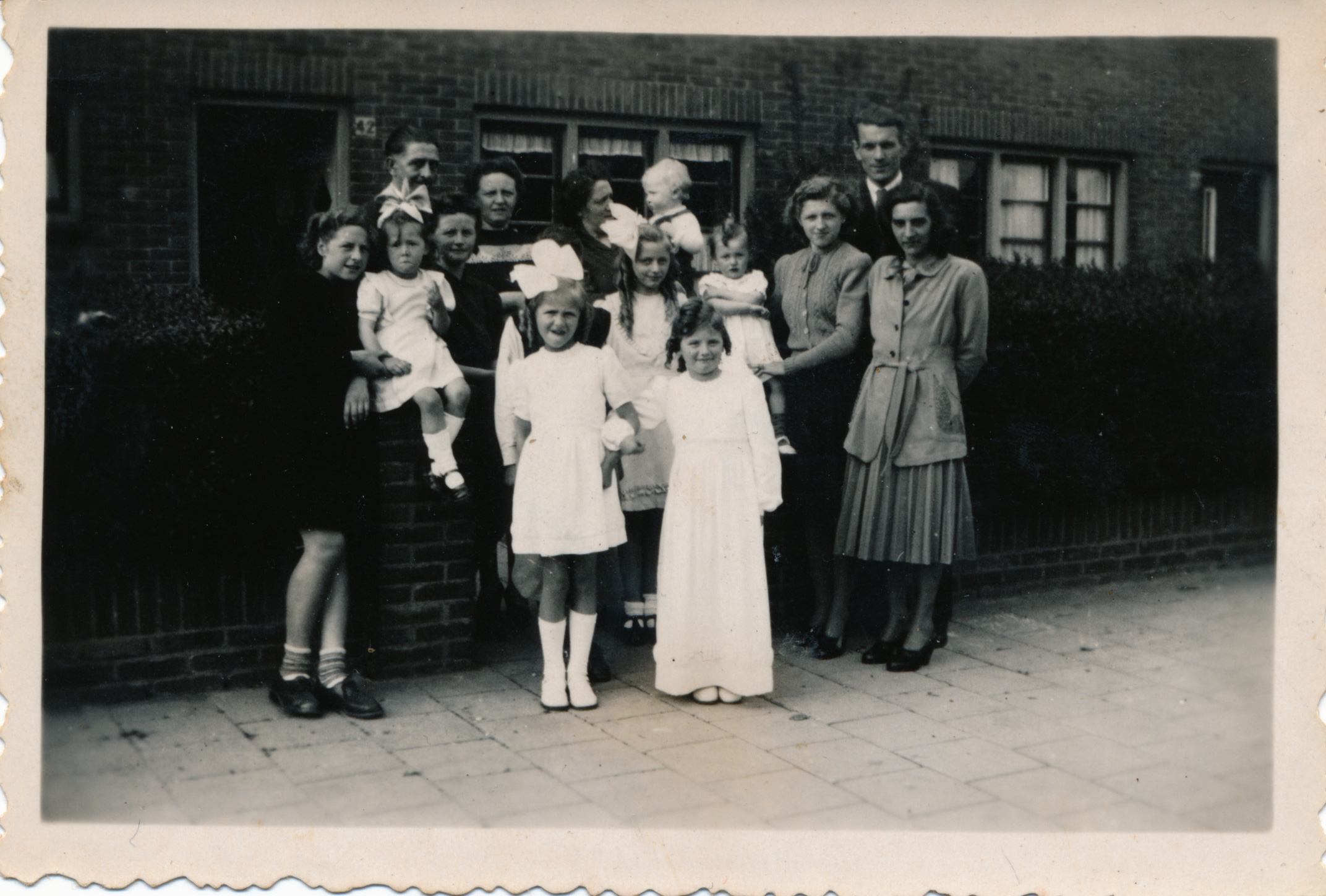 Op de volgende foto staan de gezinnen Benoist en Vernooij voor het huis met nummer 42. De kleding van de kinderen duidt op een feest met een katholieke achtergrond zoals een eerste communie.