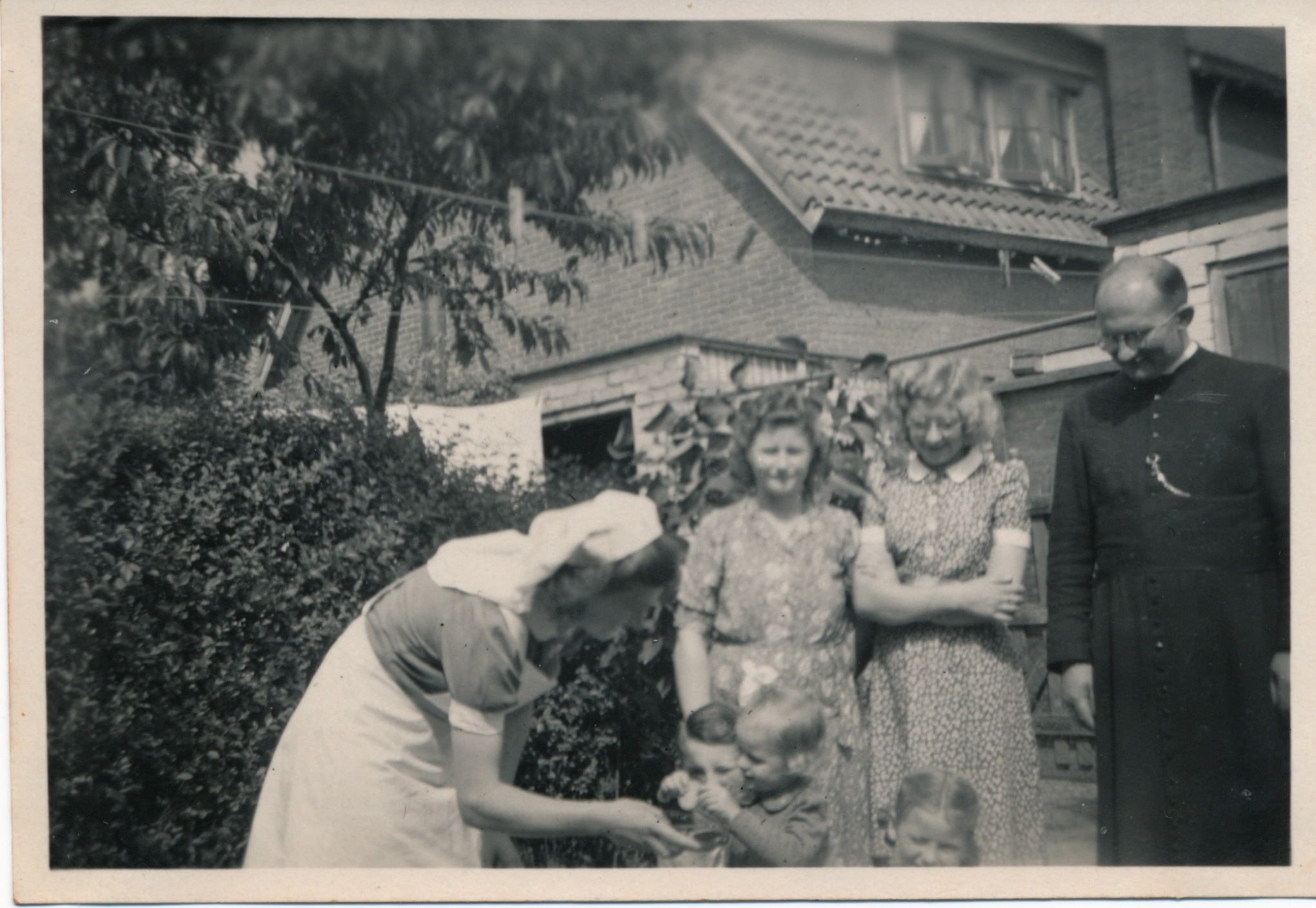 staand van links naar rechts, Zuster (gezinshulp) | Jo (Joke) Vernooy-In de weij | Cor Benoist | Priester