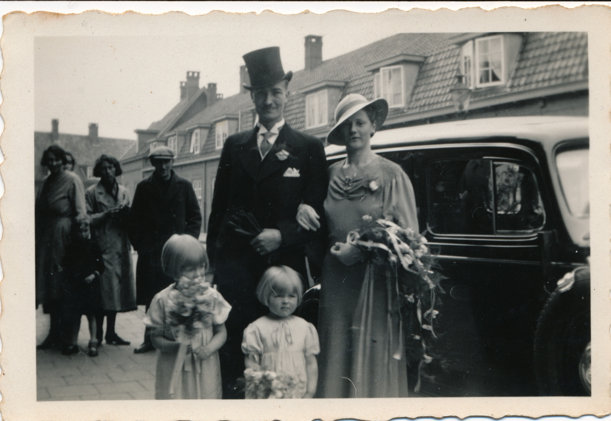 Op de foto staan een man en een vrouw. Ze lijken wat ouder en zijn deftig gekleed. De bruid draagt geen wit. Voor het paar staan de bruidsmeisjes, Tonnie en Cocky Benoist. Cocky is geboren in 1933 maar is ze twee jaar op de foto, drie jaar. Ik vindt het heel moeilijk te schatten. Na het bestuderen van de groeikalender peuter op de ouders van nu site zou ik zeggen tegen de drie jaar. Dat zou betekenen dat de foto is gemaakt in 1936.