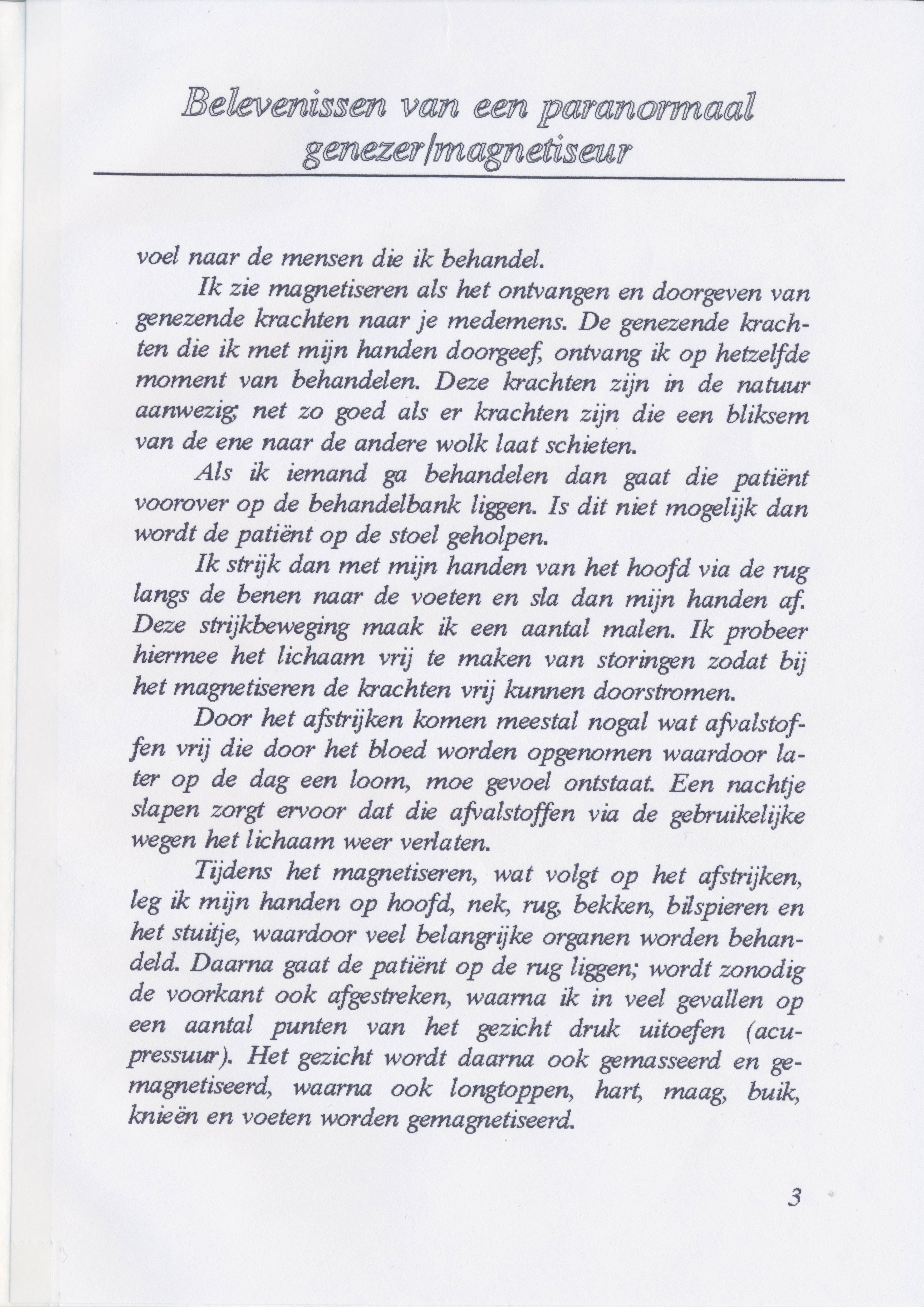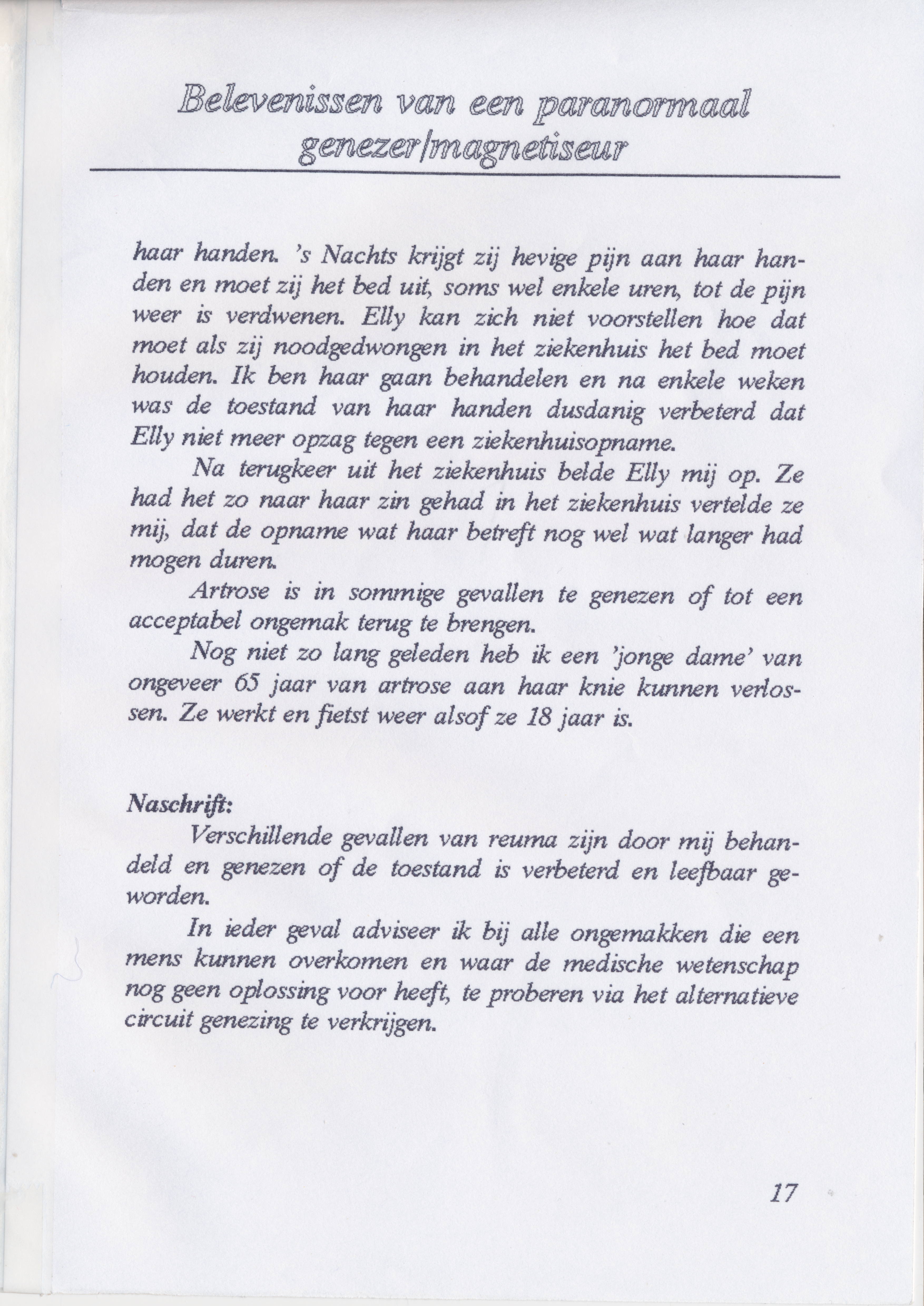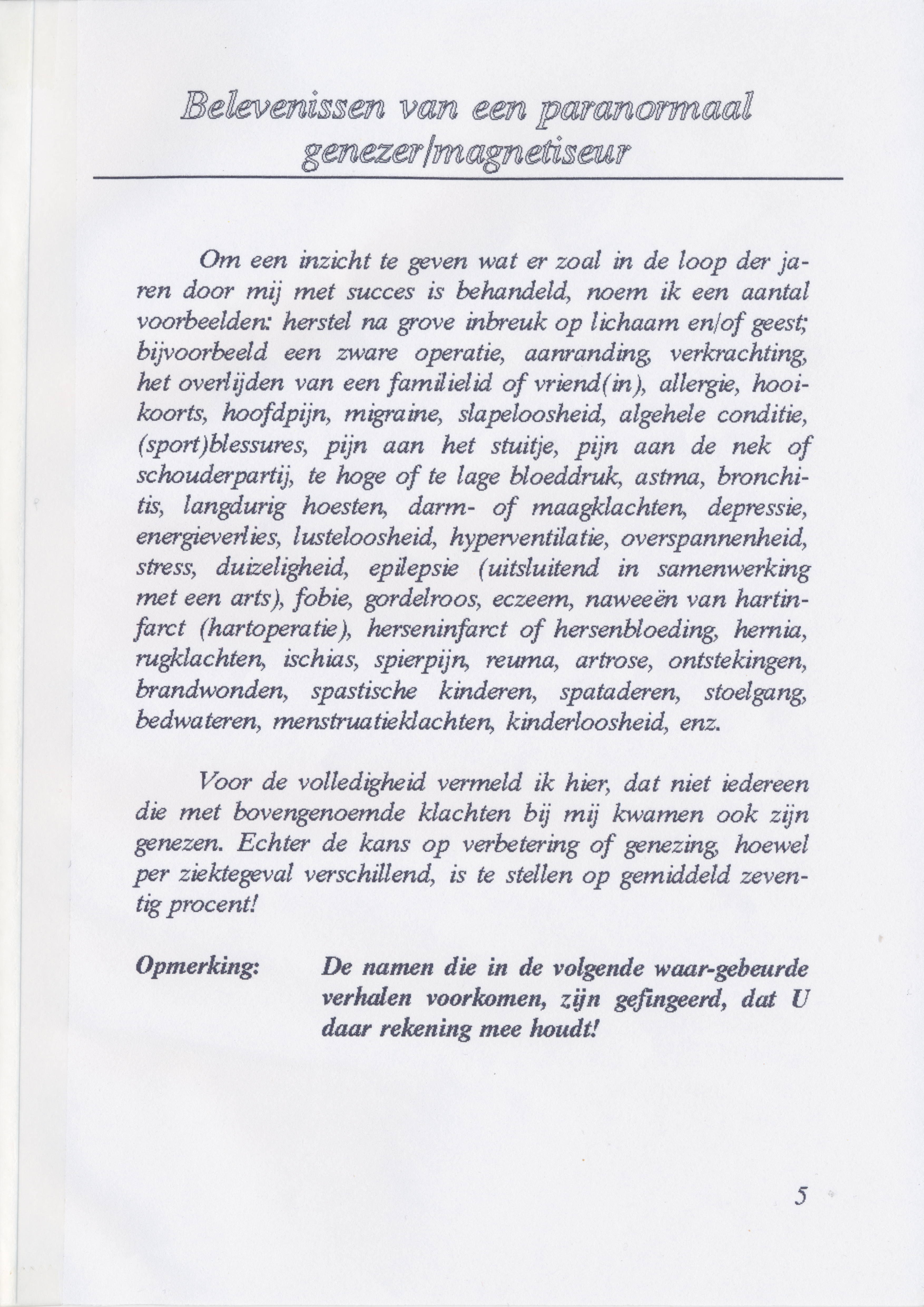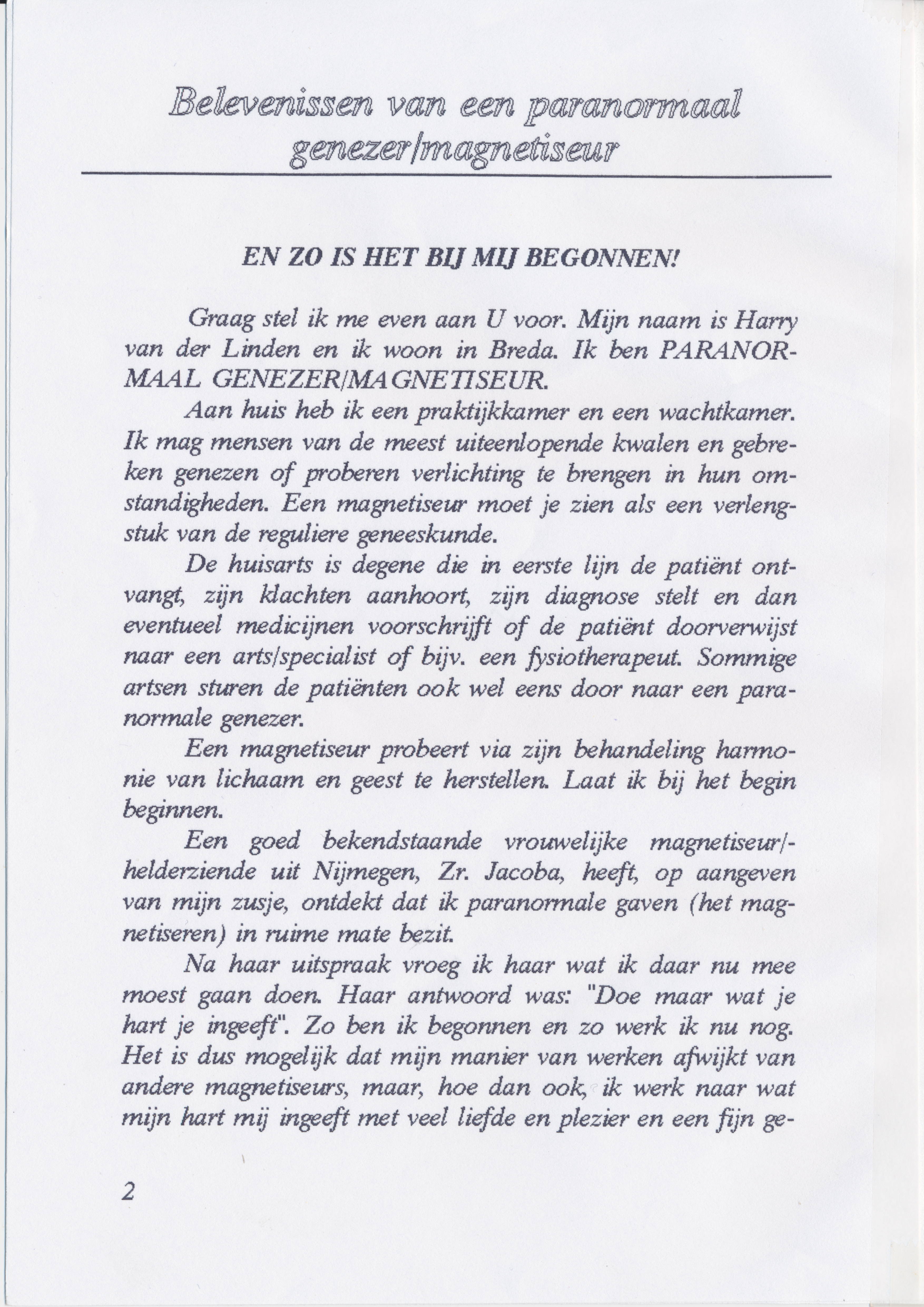 Hij schreef een boekje over zijn ervaring als genezer waarin hij verteld hoe het is begonnen en een aantal voorbeelden van behandelingen uit zijn praktijk beschrijft.