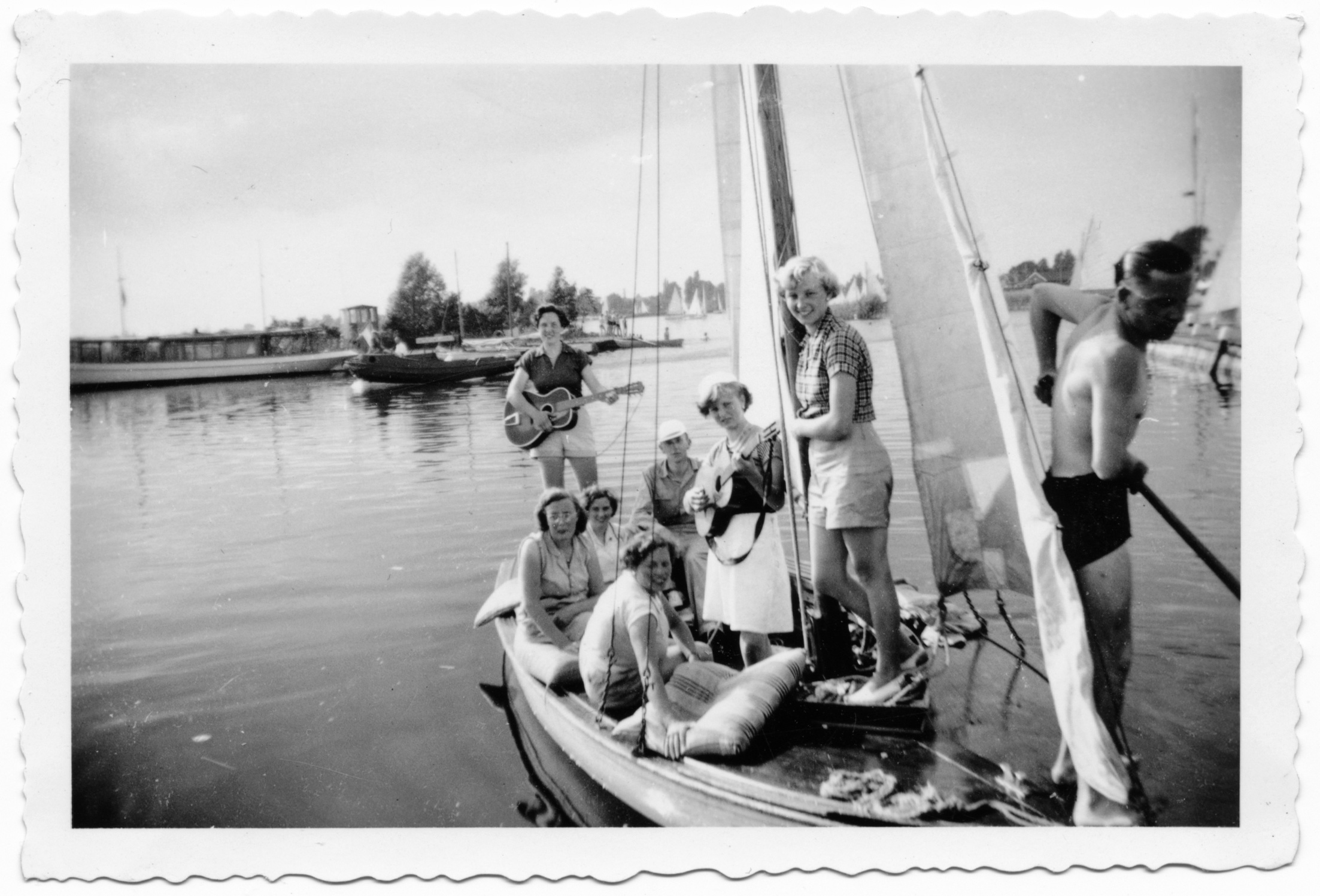 Een groepje mensen op een zeilboot, zomers gekleed, twee meisjes met een gitaar. Harry exact in het midden van het beeld. Het lijkt haast een frame uit klassieke jaren 50 film. Het is 1952, Loosdrecht.