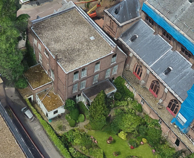 De foto is genomen achter de pastorie, een vrij kapitaal pand naast de Kerk. Via Google Maps kun je de uitbouw goed herkennen.