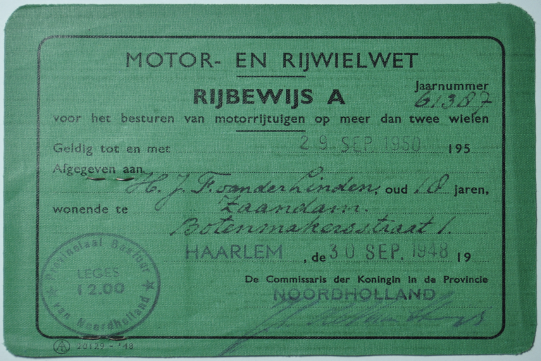 Ik denk wel dat dit later heeft plaatsgevonden, bij een verlenging van het rijbewijs. In 1951 werd een nieuwe Wegenverkeerswet en Wegenverkeersreglement ingevoerd1 en daarmee de categorieën B, C, D en E grotendeels zoals we die nu nog kennen. Het rijbewijs zoals afgebeeld van 1948 geldt voor alle voertuigen op meer dan twee wielen.